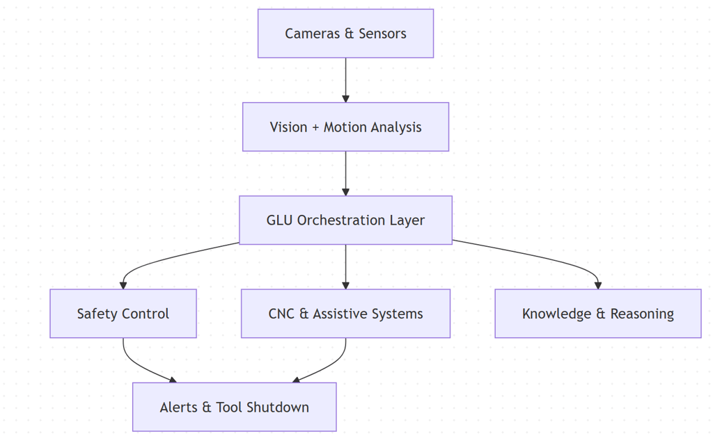 Using vision systems, motion tracking, and tool telemetry, GLU can detect unsafe hand proximity or body positioning, recognize fatigue or distraction patterns, issue escalating warnings (visual, audio, haptic), and automatically shut down tools when thresholds are exceeded.
